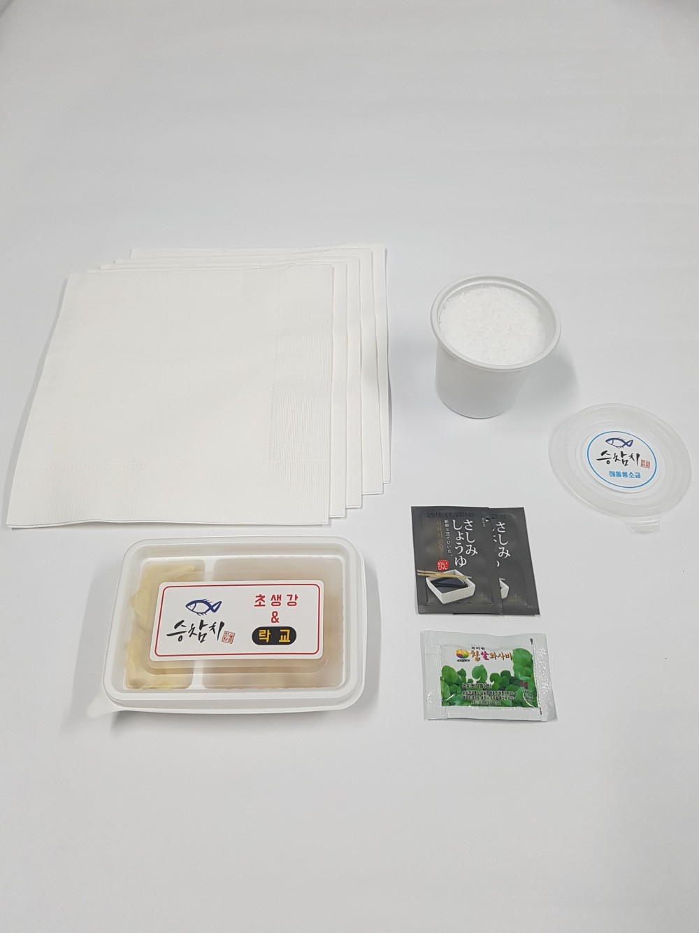 - 해동용 소금 , 손질용장갑 , 해동지 10매 , 락교&초생강 X 2 , 사시미간장 4g X 8 , 생와사비 3g X 4 , 초데리 50g